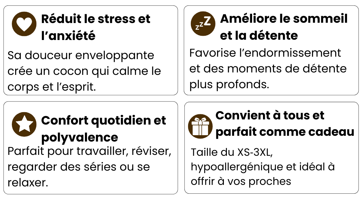 Grâce à sa douceur enveloppanteet son effet légèrement lesté, l’Eden Hoodie crée un effet cocon qui calme le corps et l’esprit. Les utilisateurs ressentent un apaisement immédiat, idéal pour réduire le stress, l’anxiété et favoriser un sommeil plus réparateur.